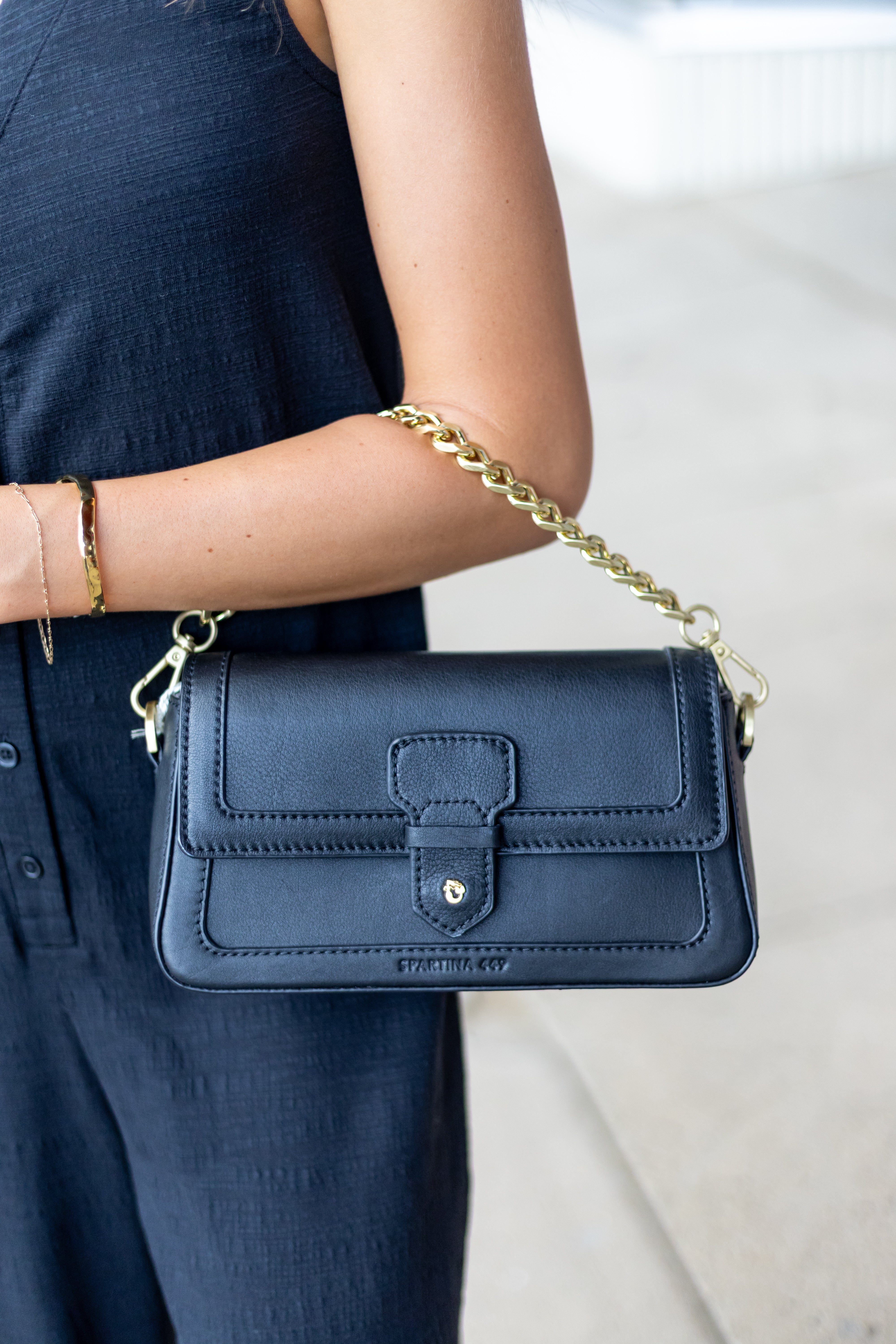 All the style in soft, premium, natural grain leather with a matte gold chain link shoulder strap. This trendy shoulder bag converts to a crossbody and will be the bag you reach for over and over again.