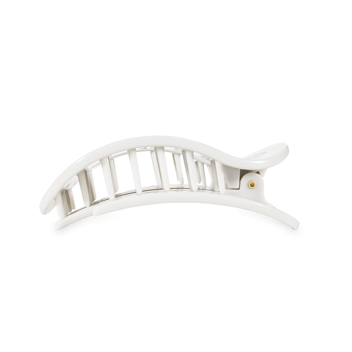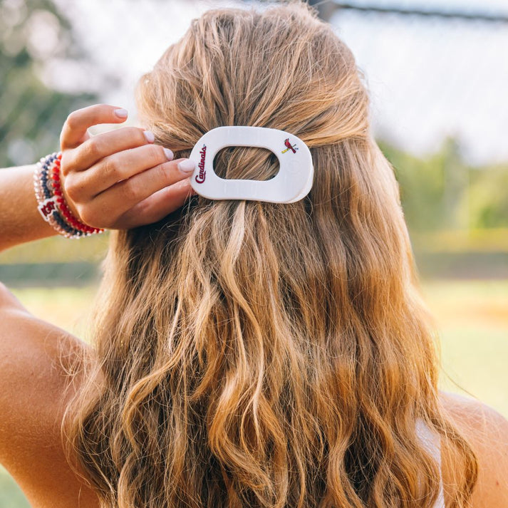 Cardinals Medium Flat Round Hair Clip in White. This hair clip is designed to allow you to lay back flat, do yoga, or sit comfortably in a seat with a headrest, and it is made with the same material that is nearly unbreakable.
