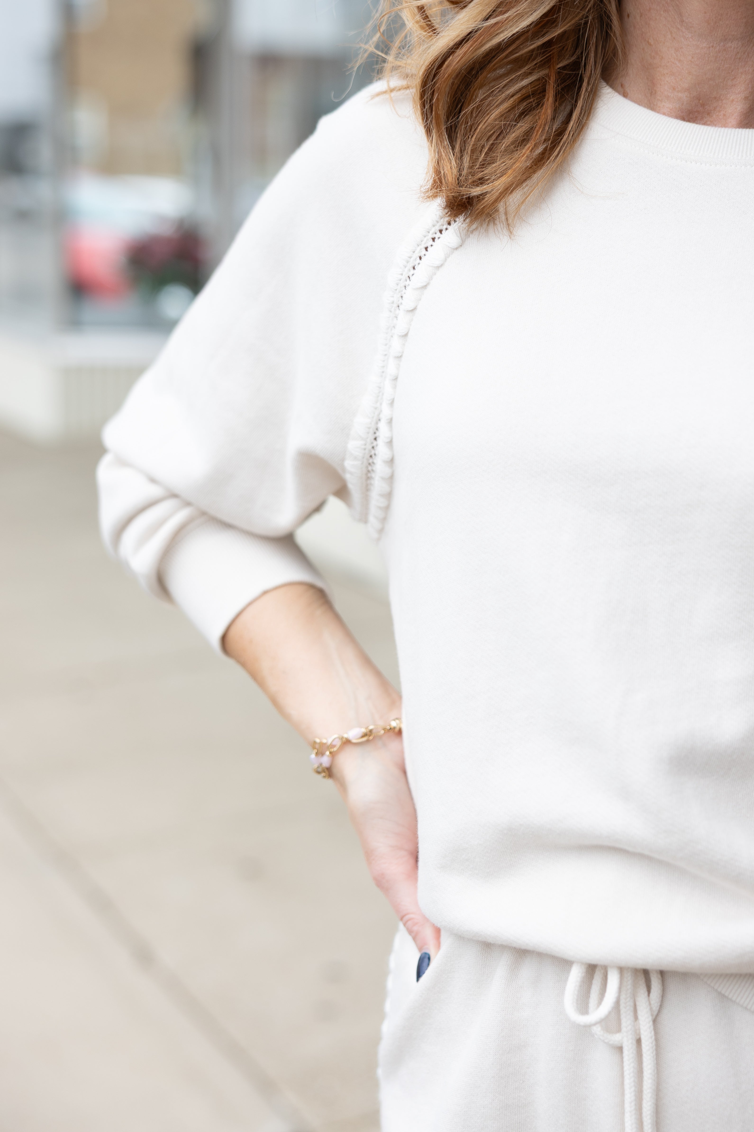 Detailed embroidery and crochet-accented raglan sleeves elevate this relaxed crewneck sweatshirt, crafted from cozy 100% cotton French terry. It's the stylish upgrade you've been looking for.