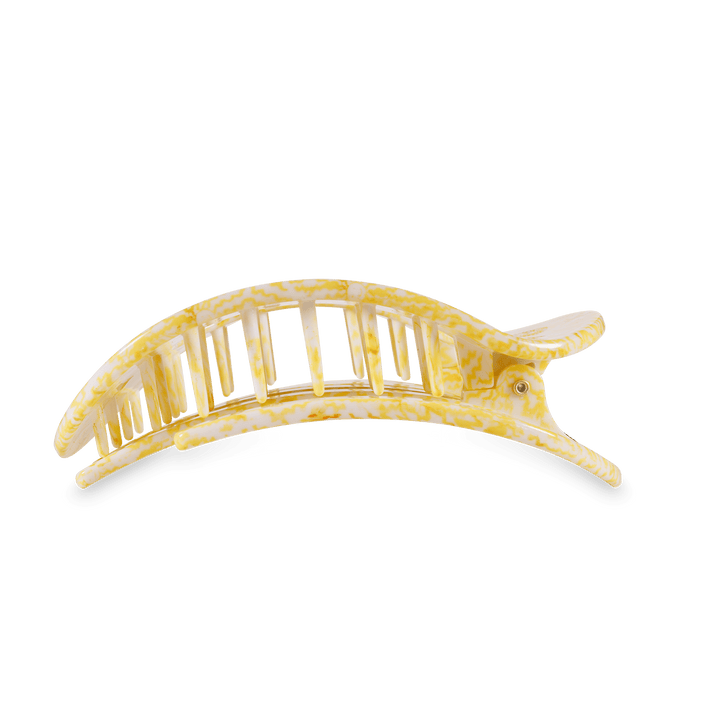 Lay flat and relax with the new TELETIES Yellow Fun in the Large Flat Round Hair Clip. This hair clip is designed to allow you to lay back flat, do yoga, or sit comfortably in a seat with a headrest, and it is made with the same material that is nearly unbreakable.