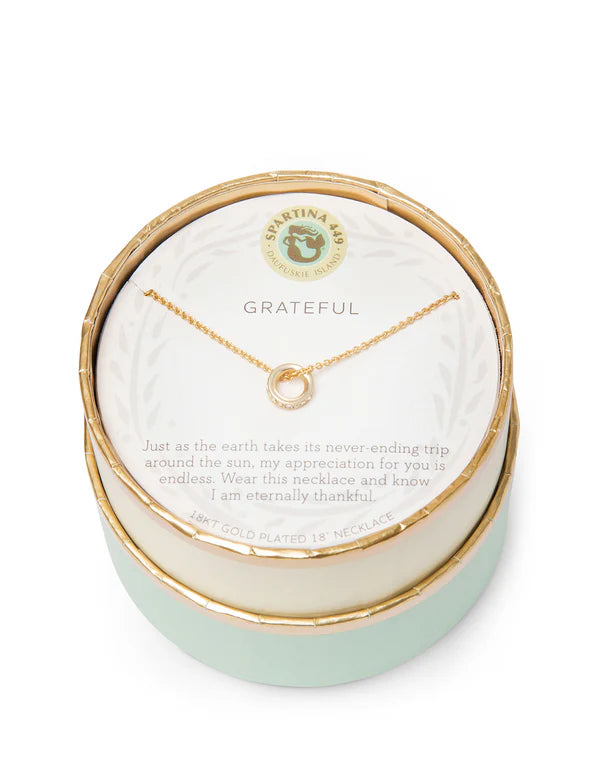 Wear our Grateful Necklace as a reminder of appreciation. Featuring a ring charm, this special piece comes packaged inside a beautiful box with the message: "Just as the earth takes its never-ending trip around the sun, my appreciation for you is endless. Wear this necklace and know I am eternally thankful."