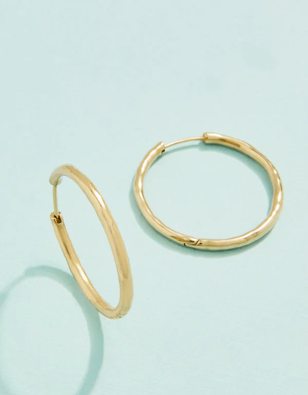 These lightweight delicately textured hoops are an everyday must have. Literally, wear them every day. Designed to shine through everyday wear, exercise, showers and a summer at the beach in tarnish free 14kt gold vacuum plating.