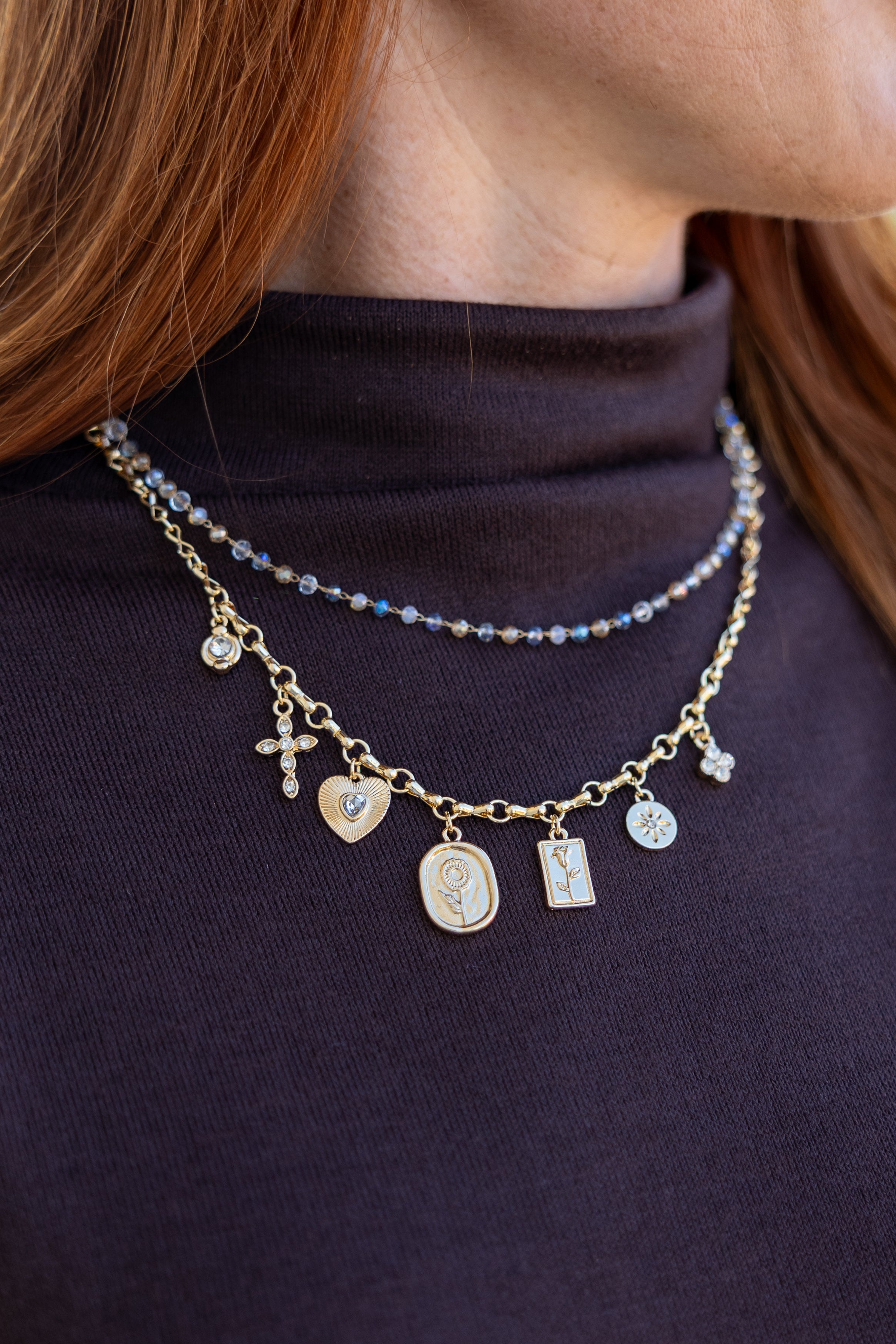 Gold Heart/Cross/Floral Charm Beaded Layered Necklace