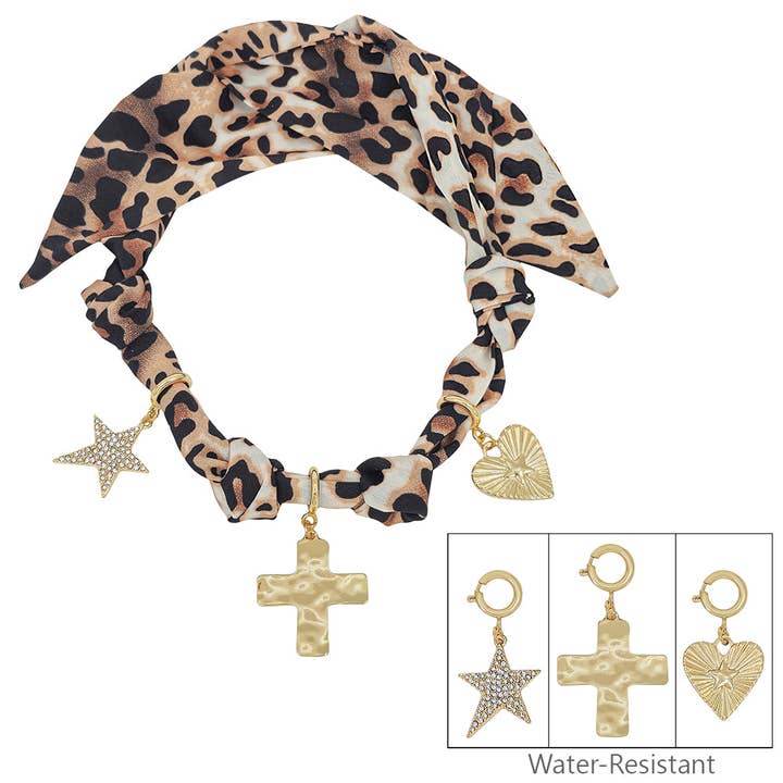Leopard Print Scarf Necklace w/ Star, Cross, & Heart Charms