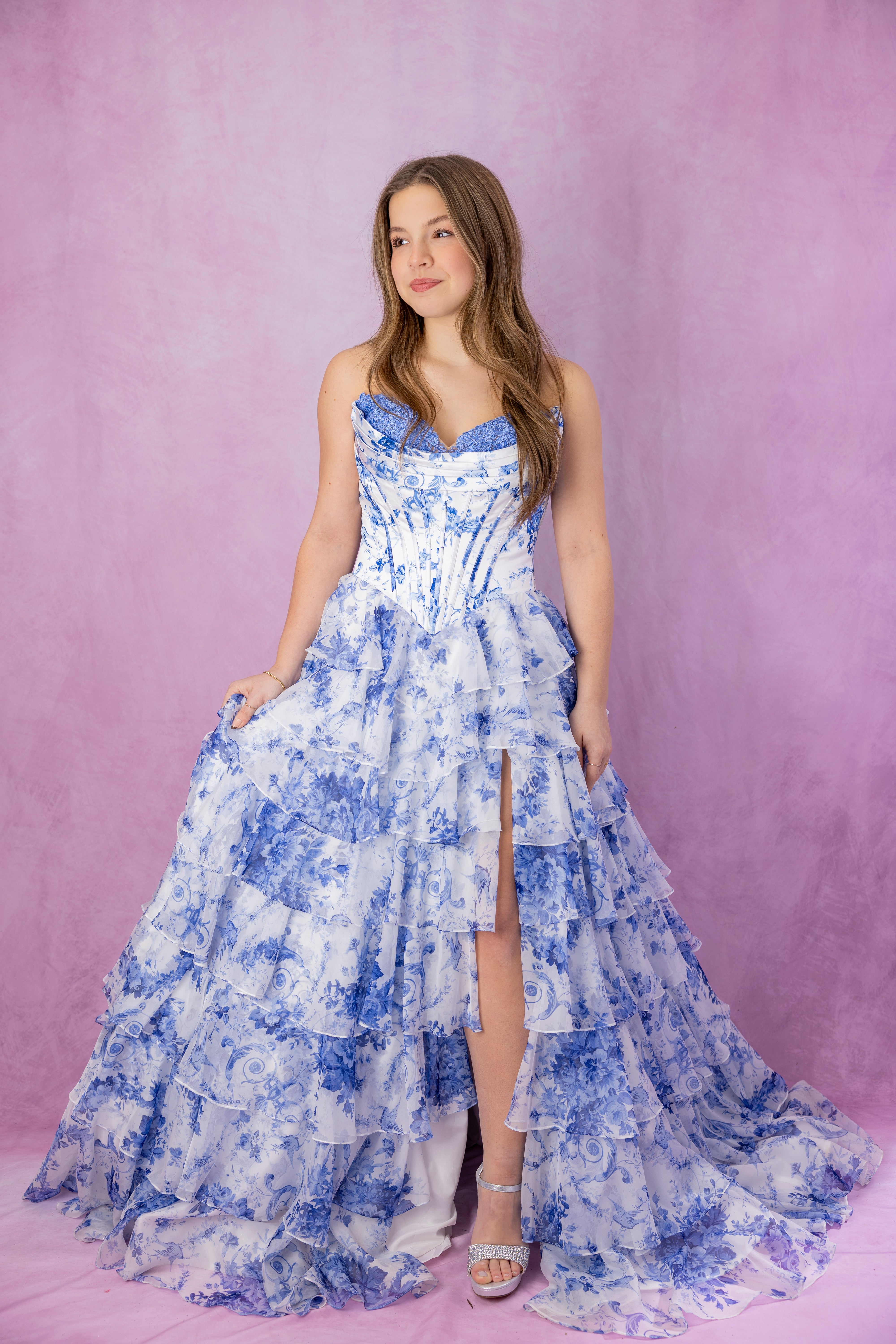 Floral blue print strapless satin corset ball gown with chiffon ruffle skirt slit.