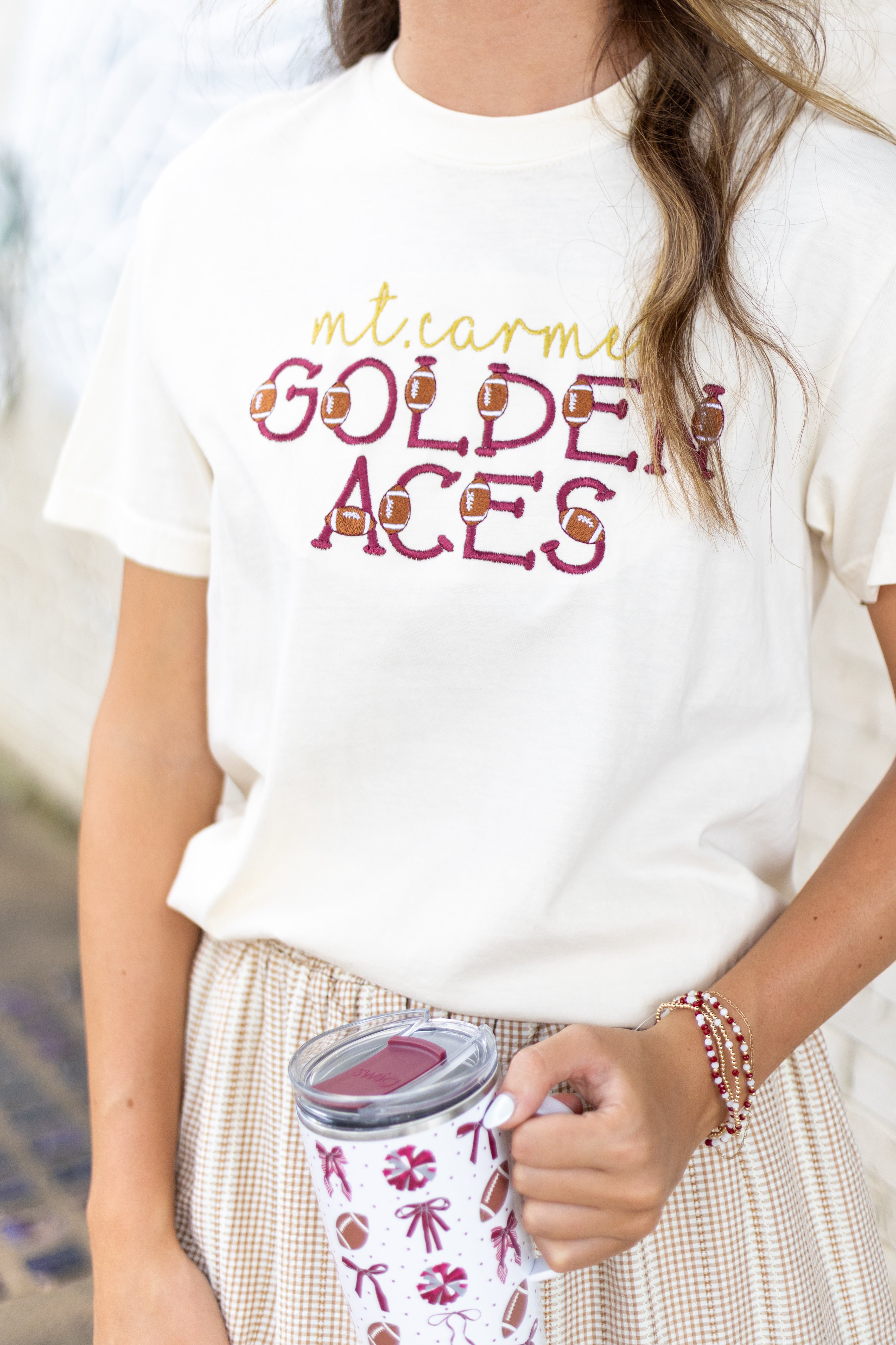 Comfort colors tee with embroidery. Model is wearing a size small.