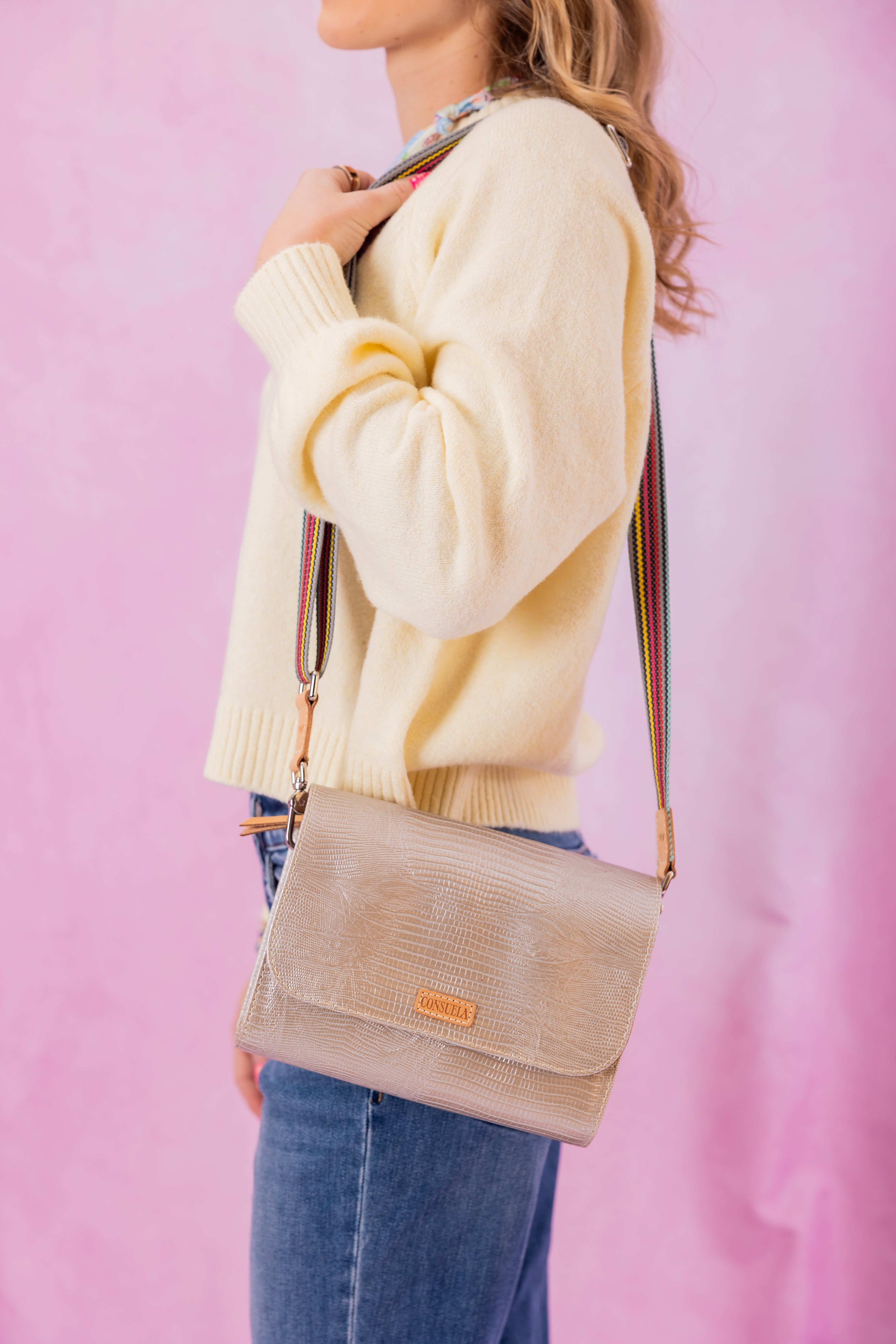 - Adjustable woven crossbody strap